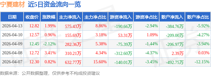 证券之星动静,截至2026年4月13日收盘,宁夏建材(600449)报收于12。82元,上涨1。99%,换手率1。07%,成交量5。12万手,成交额6494。01万元。